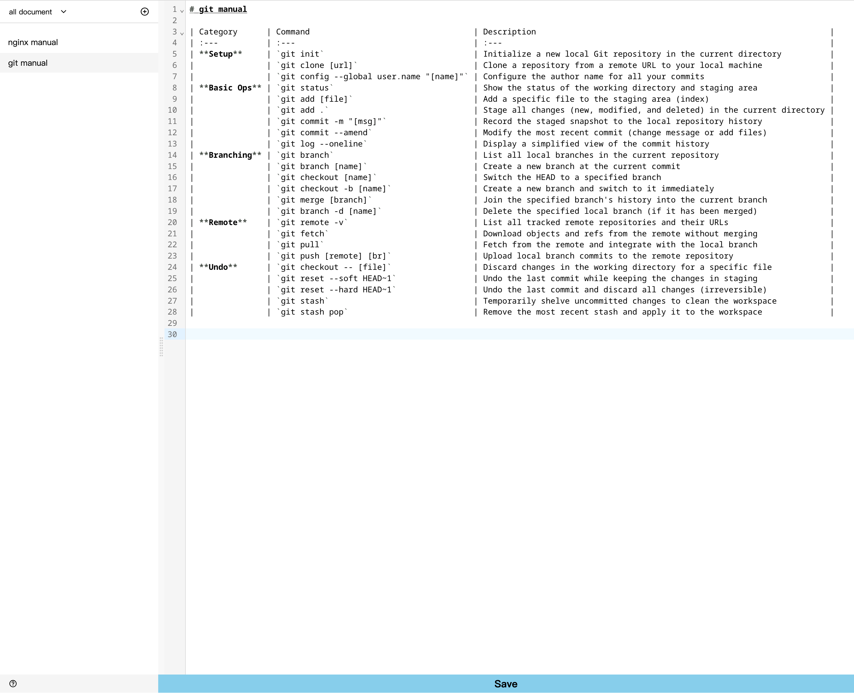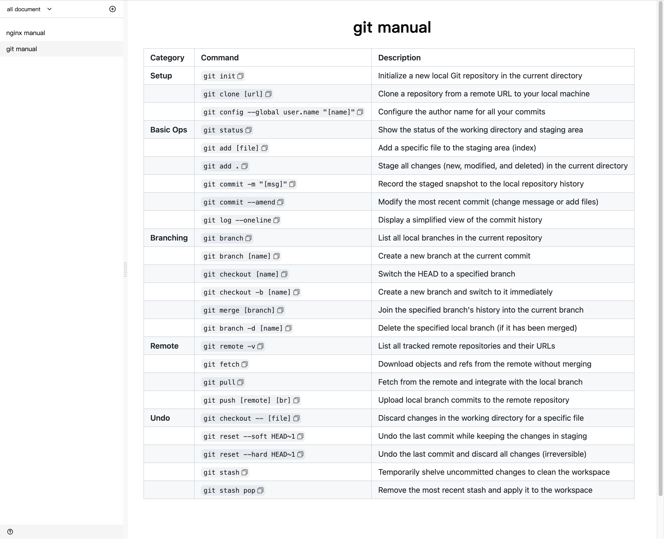 Markdown notes with built-in click-to-copy for all inline code and block code snippets.